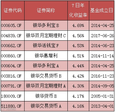 整体七日年化收益率高于全市场平均。Wind数据显示,截至2017年12月4日,银华基金旗下11只货币基金(各份额分开计算),七日年化收益率平均值高达4.28%,高于全市场的平均水平,其中有9只货币基金的七日年化收益率均超过4%。具体来看,银华多利宝B(000605)、银华双月定期理财C(004839)、银华活钱宝F(000662)、银华惠增利(000860)四只货基的七日年化收益率超过4.5%,分别为4.69%、4.56%、4.53%、4.51%。