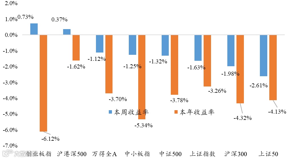 本周市场整体下行,小盘股相对大盘股表现更佳。万得全A下跌1.12%,沪深300下跌1.98%,创业板指上涨0.73%。