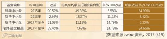 此外,无论是在成长股比较好的行情中,还是在2016年跌宕起伏的震荡市中,或者是在蓝筹、成长结构分化异常严重的2017年,银华中小盘均战胜了同期的沪深300指数和同类平均收益,平稳穿越牛熊,能够适应截然不同的市场风格。