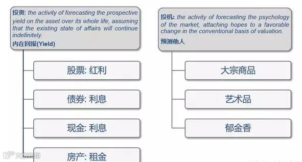在这里我援引英国著名经济学家凯恩斯对投资和投机的区分:主体需要预测的对象,是内在回报(yield),还是市场情绪(psychology)。投资预测的对象是内在回报,而投机预测的对象则是市场情绪(也就是别人的反应)。