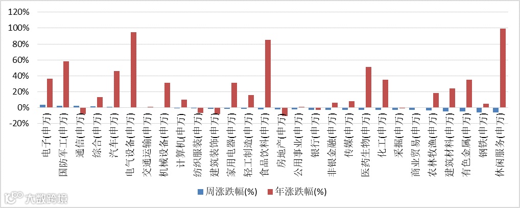 上周恒生指数周跌0.14%。上周恒生医疗保健业(+5.58%)、资讯科技业(+5.53%)、工业(+3.99%)涨幅居前;恒生公用事业(-0.13%)、必须性消费业(-0.1%)表现偏弱。