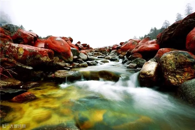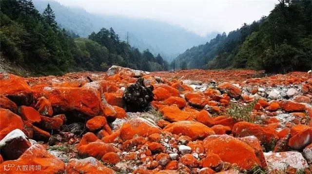 石头上生长的呈铁锈红的物质是一种极稀有的藻类(地衣的复合体),在湿度、温度、气候适宜的情况下,这种植物就会在岩石的表面自然生长,大概四五年后就会死亡,然后再生。