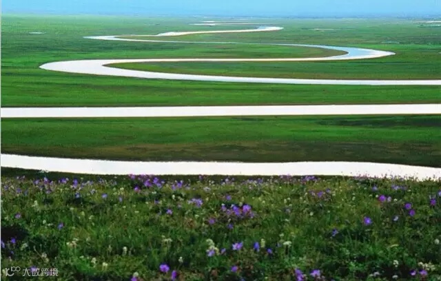 黄河自甘肃一侧来,白河自黄河第一湾湾顶汇入,型如“S”型,黄河之水犹如仙女的飘带自天边缓缓飘来,在四川边上轻轻抚了一下又转身飘回青海,故此地称九曲黄河第一湾。