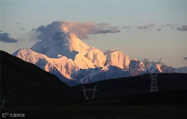 阳光出来了,贡嘎山峰闪耀着圣洁的银色光芒,群山拱卫,仿佛是绿色的基座,托起透明的钻石。