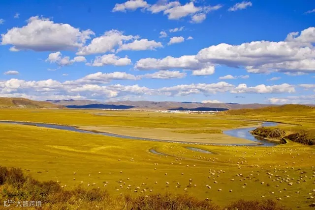 夏季,牦牛、绵羊游牧,帐房星星点点,绿色无边,叹为观止。热尔大坝是中国最平坦辽阔的湿地草滩。