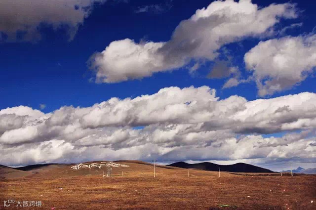 辽阔旷远的高原,淡蓝的天空,深蓝的穹宇,白云时而在山巅堆积,时而在长空流徙,如雪莲簇拥,似哈达飘飞。