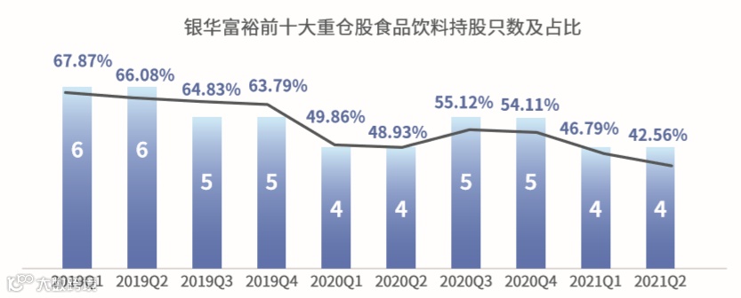 (数据来源:基金定期报告,截至2021.6.30,银华富裕前十大重仓股中食品饮料持股占比计算方法:前十大重仓股中食品饮料个股占基金资产净值比例加总/前十大重仓股占基金资产净值比例加总。)