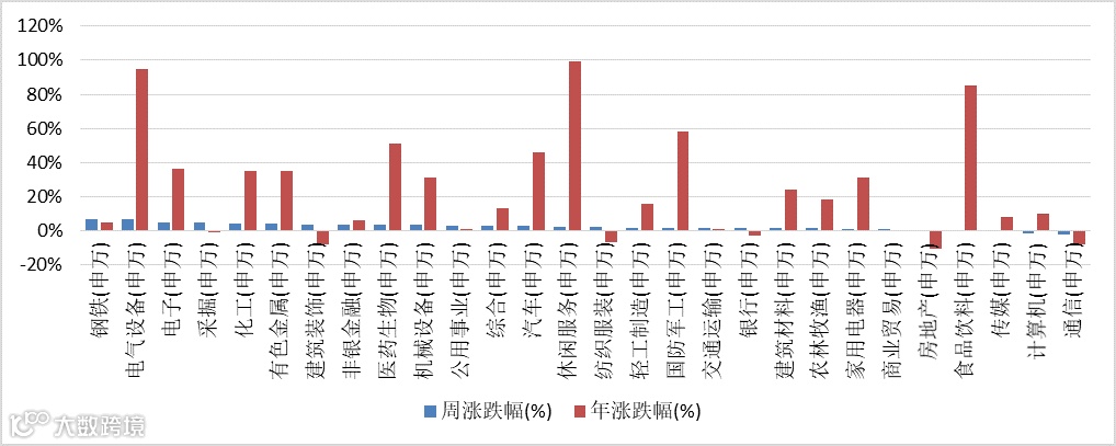 上周恒生指数周涨1.69%。行业方面,恒生原材料业(+5.63%),能源业(+5.40%),医疗保健业(+5.38%)涨幅居前;恒生必需性消费业(-0.25%)、金融业(+0.46%)表现偏弱。
