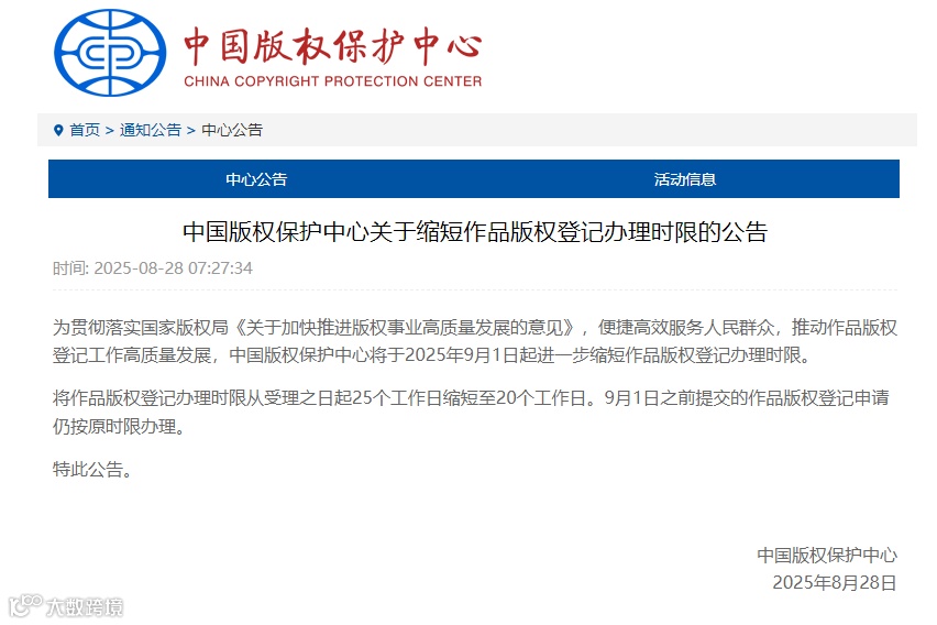 保护中心正式发布公告:自9月1日起,进一步缩短作品版权登记办理时限。该举措是对国家版权局《关于加快推进版权事业高