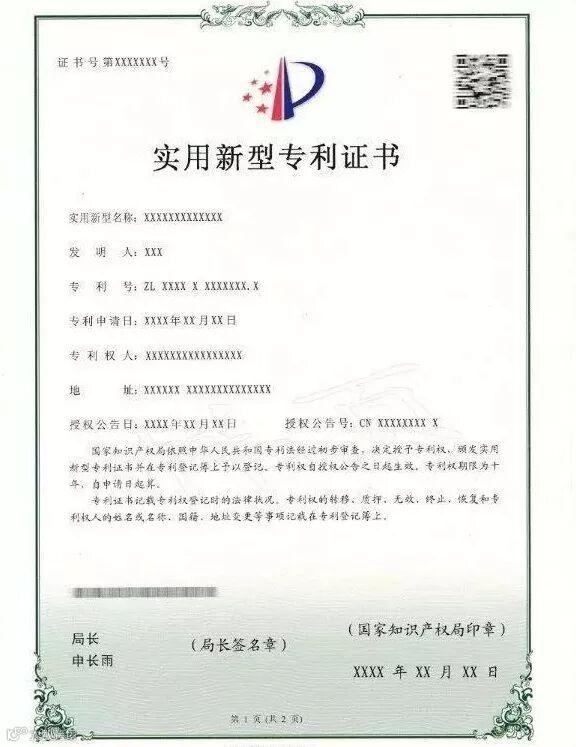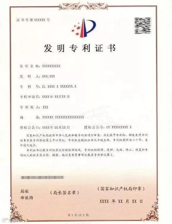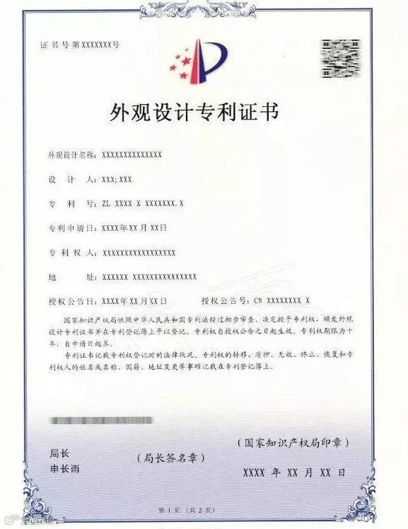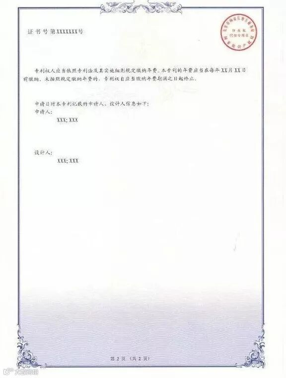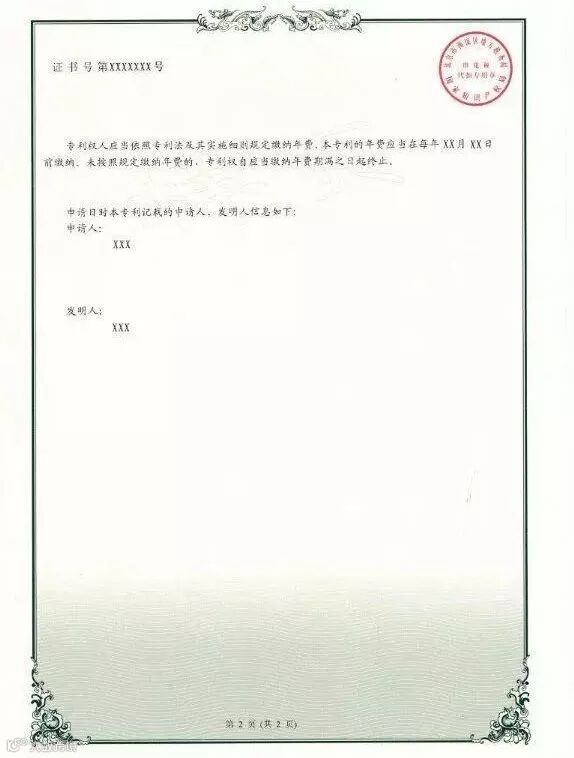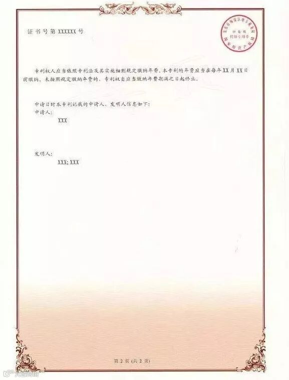 四、新版专利证书及专利证书副本不再使用专利证书封套,仍采用A4规格、竖排版;由单面改为正面、背面,背面只加框,没有徽标及印章;在证书正面原印花税标的位置增设二维码,将印花税标移至证书背面;在证书背面增设该专利申请日时的申请人、发明人或设计人信息。
