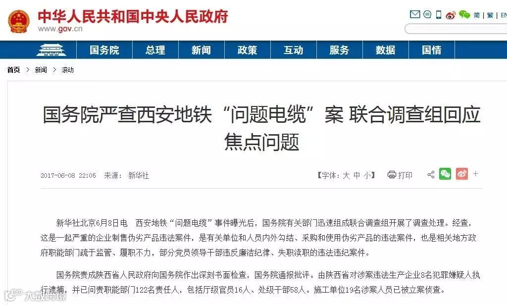 6月8日,国务院决定依法依纪对西安地铁“问题电缆”事件严厉问责!