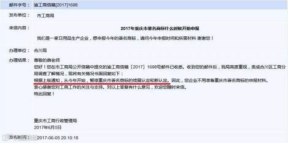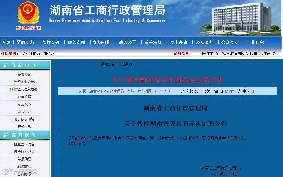 其实,早在国家工商总局正式表态前,湖南省和重庆市工商行政管理局已经先后暂停了2017年著名商标的认定事宜。