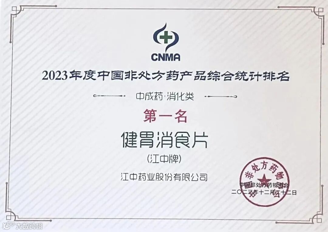 在这段旅程中,江中牌健胃消食片取得了一个又一个喜人成绩:2008年,年销量突破2亿+盒;首个破10亿的OTC黄金大单品;2009年,品牌知名度突破96%,至2023年,二十年蝉联“中国非处方药产品榜”中成药消化类第一名,“全民美食节,江中夜消季”活动走向全国……在一次又一次与消费者的双向奔赴中,健胃消食片在充满不确定性的市场中,找到了属于自己的“确定性”。“胃肠健康的专家与领导者”是品质认证,亦是使命担当。