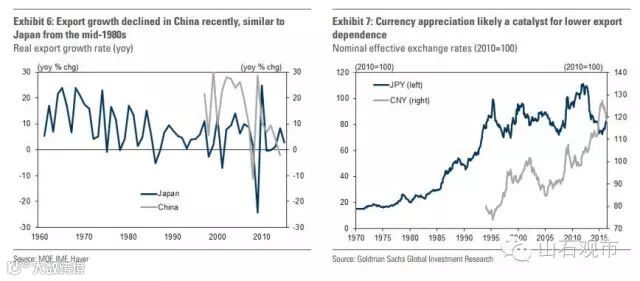 出口都是高速增长期的重要引擎。两国货币在经济转型前都大幅升值,转型期间却又因此备受煎熬。日本出口下降拐点开始于美国牵头的广场协议,中国则是受累于美国引发的全球金融危机;