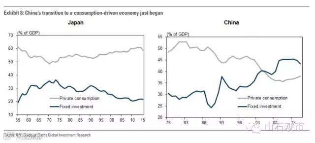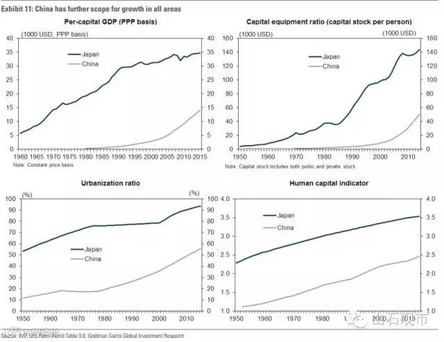 高盛的结案陈词是:对于中国的产能过剩和不断上升的债务水平,有不少担忧。日本在上世纪90年代经济泡沫破裂后,经历了失去的20年。中国似乎坚定的认识到这些问题,并且想要从日本的经历中汲取经验。中国遵循了类似于日本的经济发展路径,但现在,相比日本,中国仍然具有巨大的经济发展潜力。