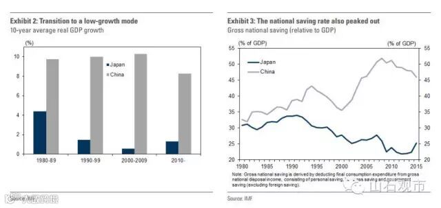 与此同时,中国正从过去高增长的时代,进入新的经济发展阶段,所谓新常态。而海外观察家则指出,中国如今的资本过剩和债务问题,与过去的日本有相似之处。高盛试图总结日本过往经历的经验,分析中国现在和过去日本之间的相似处和不同点,借此以为中国未来的借鉴。
