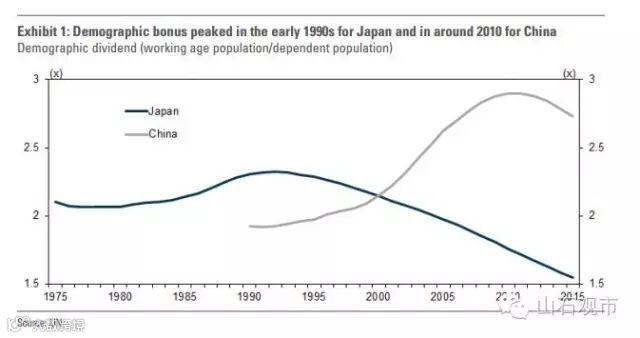 在人口方面,中日相似点在于:在人口方面都出现了劳动力人口(15-64岁)增速下降的拐点,也就是“人口红利”改变的问题。