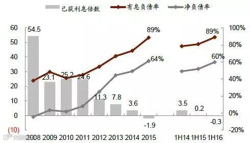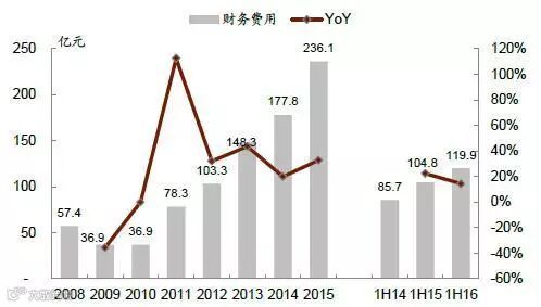 5、2009~2015 的8 年中,板块有息负债率由39%不断攀升至92%,板块净负债率则由-4%上升至64%。1H16 财费同比上升14%至120 亿元,增势有所放缓。上半年板块有息负债率与净负债率分别增加8.2ppt、8.0ppt 至89%和60%。
