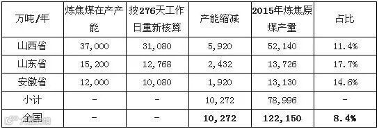 以主要省份的炼焦煤在产产能测算,276 天工作日制度实施后山西,山东及安徽省合计产能缩减超1 亿吨,占比2015 全年炼焦原煤产量的8.4%。