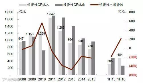 2008-2016年中国煤炭行业经营性CF流入及投资性CF流出
