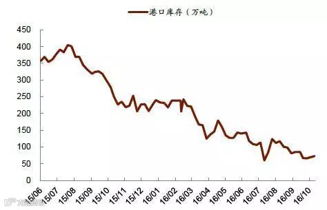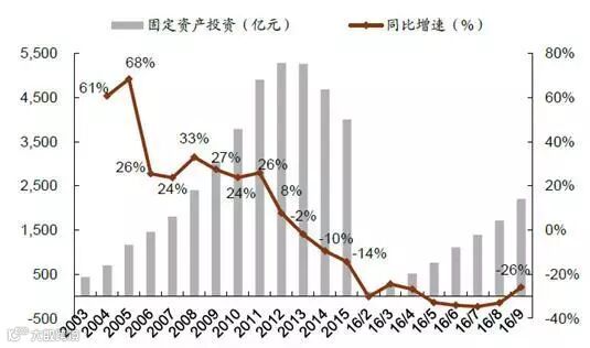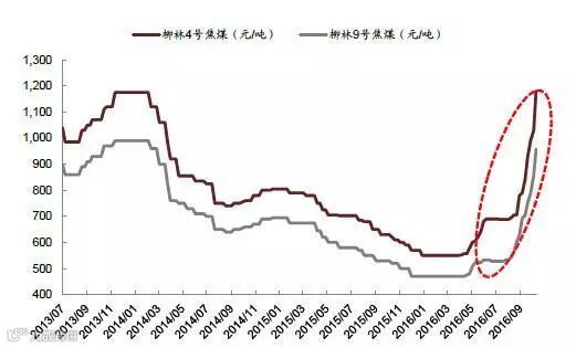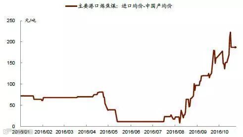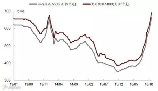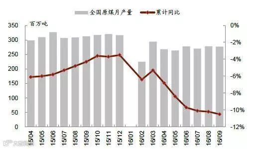 2016 年春节之后,重大矿难引发的山西整合煤矿停产整顿,276 天工作日的执行以及厄尔尼诺现象带来的暴雨等等因素,煤炭行业供给收缩开始逐步显现。今年前9 月煤炭产量累计同比下滑10.5%。而虽然与此同时煤炭的消费量依然在下滑,由于其降幅(同比-2.4%)不及产量下滑的速度,供给缺口不断扩大,库存持续走低,推动价格快速上涨。截至11 月3 日,秦皇岛5,500 大卡动力煤年内累计上涨90%至697 元/吨,柳林4 号焦煤年内累计上涨151%至1,380 元/吨。