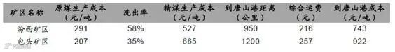 汾西矿区到厂成本最低。在北方六大矿区中(汾西,西山,开滦,离柳,乌海和包头矿区),汾西矿区的原煤生产成本最高,约291 元/吨,但凭借其较高的精煤洗出率(58%)和便利的交通运输条件(运距950 公里),到唐山吨煤成本最低,约743 元/吨。而包头矿区虽然原煤生产成本低至207 元/吨,但精煤洗出率仅为35%,且到达唐山港的距离较长为1,200 公里,吨煤到厂成本约922 元/吨。