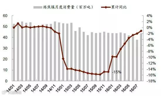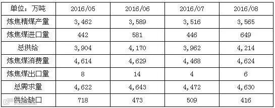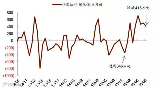 今年受276 天限产的影响,焦煤供给大幅收缩。截至今年8 月份数据,炼焦煤供给缺口较7 月环比收窄18%,但供给不足仍高达416 万吨,而2015 年底炼焦煤供给则为过剩346 万吨。