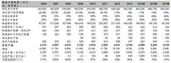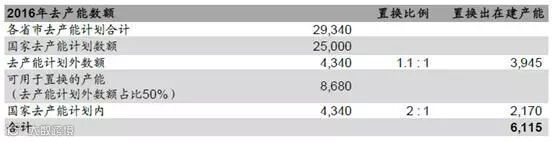 我们假设极端情形:1)2016 年去产能计划外数额(即:各省市计划合计减去规划内的2.5 亿吨)占比总置换产能的50%;2)计划外去产能数额按照1.1:1 的比例置换出在建产能;3)计划内去产能数额(2.5 亿吨)可按照50%置换出在建产能。如下表所示,2016年通过关闭退出矿井(计划内部分+超计划部分),合计可置换出在建矿井产能超6,000万吨。