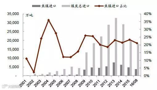 2001-2016年炼焦煤占比总煤炭进口份额