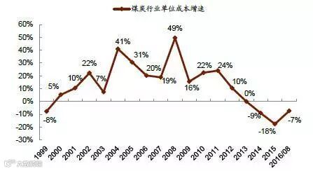 1999-2016年中国煤炭行业单位成本增速