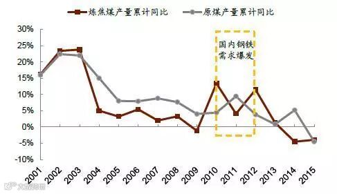 2001-2015年炼焦煤及原煤产量增速对比