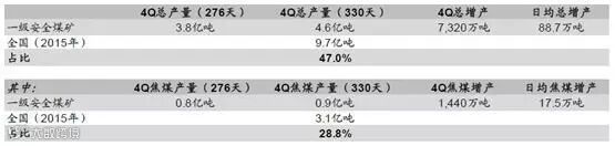 一级安全煤矿产能合计占比全国在产产能近50%。根据国家安监局公布的名单,获批2015 年度一级安全煤矿共789 座,占比全国生产煤矿数的13.7%;合计煤炭产能约18.3 亿吨,占比全国在产煤炭产能的近50%;其中涉及焦煤产能3.5~3.8 亿吨,占比全国在产焦煤产能的~30%。