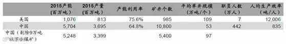 行业整体人均产煤量仍然偏低。2015 年我国人均产煤量约为835 吨,而美国人均产煤量则为12,006 吨(其中Cloud Peak 高达48,000 吨/人)。整个行业生产率与发达国家差距显著,效率亟待整合提高。
