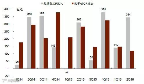 2008-2016年中国煤炭行业经营性CF流入及投资性CF流出季度分析