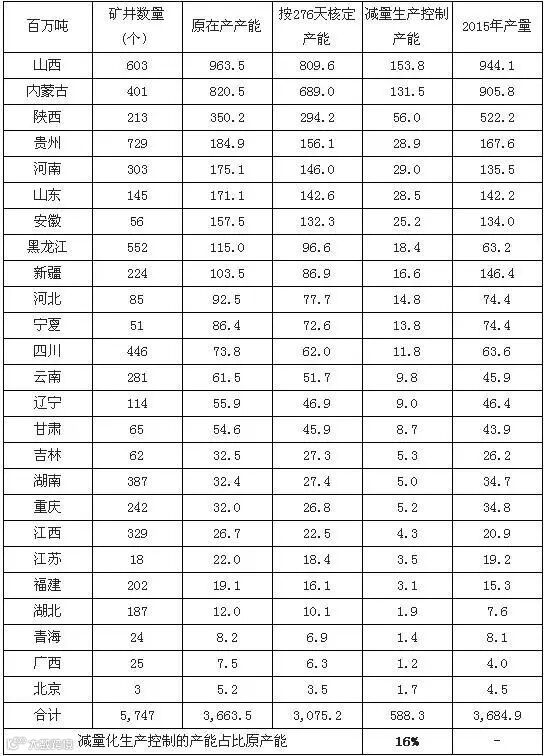 3 月底,国家发改委、人社部、能源局和安监局联合下发《关于进一步规范和改善煤炭生产经营秩序的通知》,全国煤矿自2016 年起按照全年作业时间不超过276 个工作日(原330 日),将煤矿现有合规产能乘以0.84 的系数后取整,作为新的合规产能。2016 年4月1 日,山西省率先实施276 天工作日制度;内蒙古,陕西,山东等省份于5 月1 日起严格执行。
