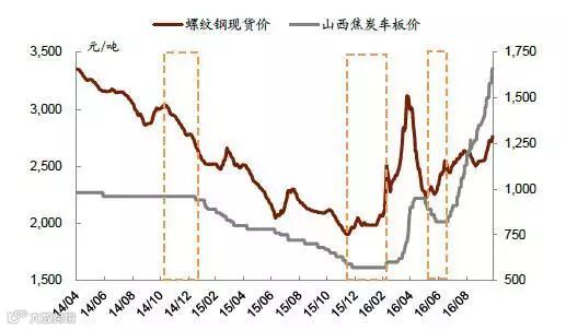 从生产流程上,炼焦煤作为炼焦原材料处于产业链最上游,焦炭品种处于产业链中间,应运于最下端的钢铁行业的高炉冶炼。通常焦炭受到上游煤矿企业和下游钢厂的两头挤压,利润空间最小,处于弱势地位。各环节间传导具有一定时滞性。当钢铁价格上升,钢企利润增厚至一定程度时,各大钢企不惜提价增加对焦炭采购从而带动焦炭价格上涨。此轮钢铁价格上涨启动于2015 年12 月,而至今年3 月初焦炭品种开始提价,传导时滞约3 个月。当炼焦企业下游订单饱满急需增加原料采购时,上游焦煤企业获得议价话语权,焦煤价格顺势上涨。通常焦煤涨价滞后焦炭提价的2~3 周。