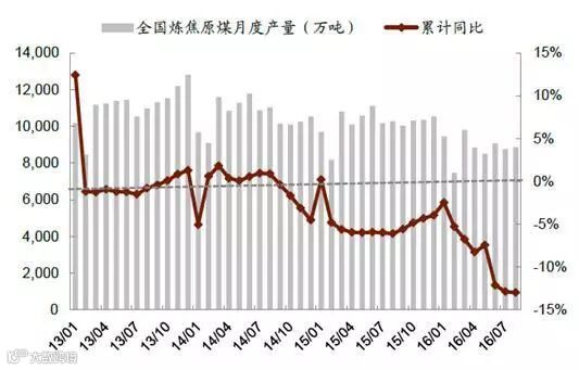 2016 年以来,受政策限产影响,炼焦原煤产量同比跌幅不断扩大。2016 年1-8 月,全国炼焦原煤累计产量同比下降13%至7 亿吨,降幅较今年4 月扩大4.7ppt。