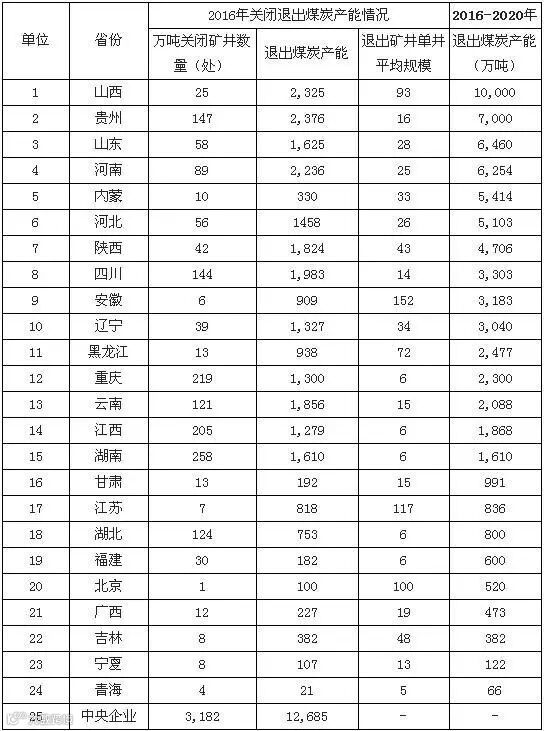 各省公布的煤炭去产能计划梳理