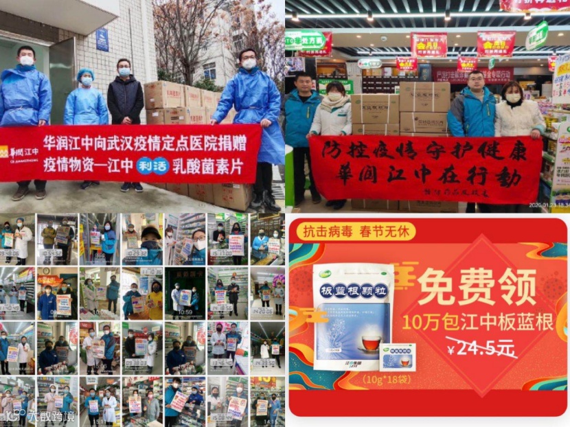 1月23日华润江中联合1药网,发起"抗击病毒,0.1元换购江中板蓝根"公益活动,覆盖武汉、深圳、北京、上海等23省份,93个城市,累计换购10万袋价值245万元。