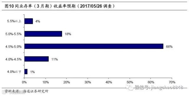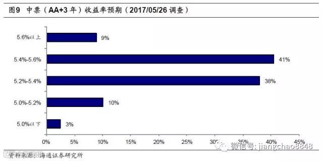 金融去杠杆冲击信用债需求,5月中票收益率大幅上行,在月末才有所企稳,本期调查时3年期AA+中票收益率在5.3%附近。