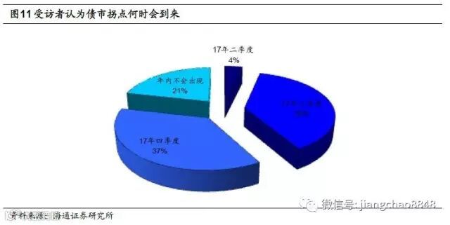 根据我们的调查结果,有接近80%的受访者认为年内会出现债市的拐点,但是到来的时点分歧较大。具体来看,认为年内会出现拐点的受访者主要分歧在于拐点是在三季度还是四季度到来,认为在三季度出现的受访者占38%,认为在四季度出现的占37%,认为二季度拐点就能到来的受访者极少;此外还有21%的受访者比较悲观,认为年内不会出现债市的拐点。