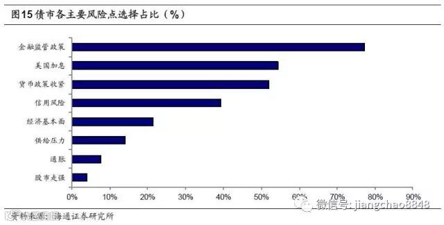 债市仍最担心政策风险。对于债市最担心的风险点,受访者最担心的是金融监管政策,近期监管出手频率加高,未来如何落地将直接关系到市场表现,监管政策仍是决定债市走势的主要变量。此外美国加息,货币政策收紧成为投资者第二关心的风险点。随着企业融资环境的收紧,投资者对信用风险也较担心。