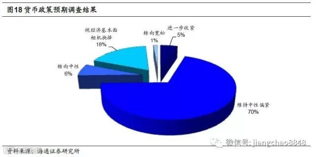 货币政策:维持中性偏紧,转向可能性低。金融降杠杆正当其时,货币政策未见放松,同时4月开始经济数据全面下滑。对于未来央行将如何实施货币政策,70%投资者认为央行将“维持中性偏紧”,选择“进一步收紧”或“转向中性”只占5%左右,同时有接近18%的受访者认为央行货币政策将“视经济基本面相机抉择”。