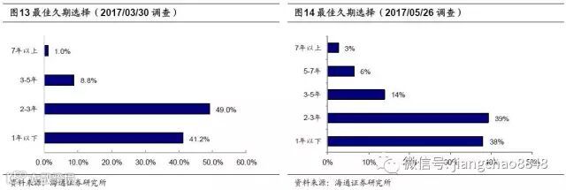继续上调逆回购利率,但存准利率上调预期不高。如果美国六月加息,65%的受访者认为央行将跟随行动“上调逆回购招标利率”;认为会上调存贷款基准利率的仅约15%。