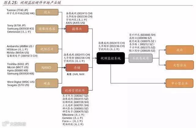海康威视:针对公安行业、交通行业、金融行业、司法行业、能源行业、智能楼宇行业、 文教卫生等七大行业分别开发了各自的解决方案。根据 IHS 的统计,海康的 iVMS 系列 产品中国市场占有率 23%。