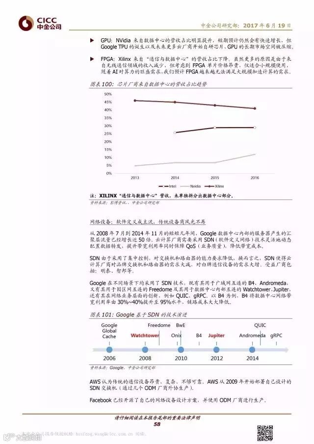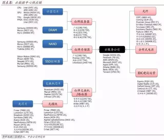 计算芯片:目前的竞争对手包括 NVidia/AMD 的 CPU,谷歌的 TPU,Xilinux 的 FPGA 之间在计算成本和速度上的竞争。这些公司之间的竞争类似与高通和联发科在手机 芯片上的竞争。在 TPU 的例子上我们看到,谷歌利用其在软件开发框架上的优势, 减小切换计算芯片(GPU to TPU)时的软件修改成本,形成一个 Tensor Flow+TPU 的封闭生态环境。