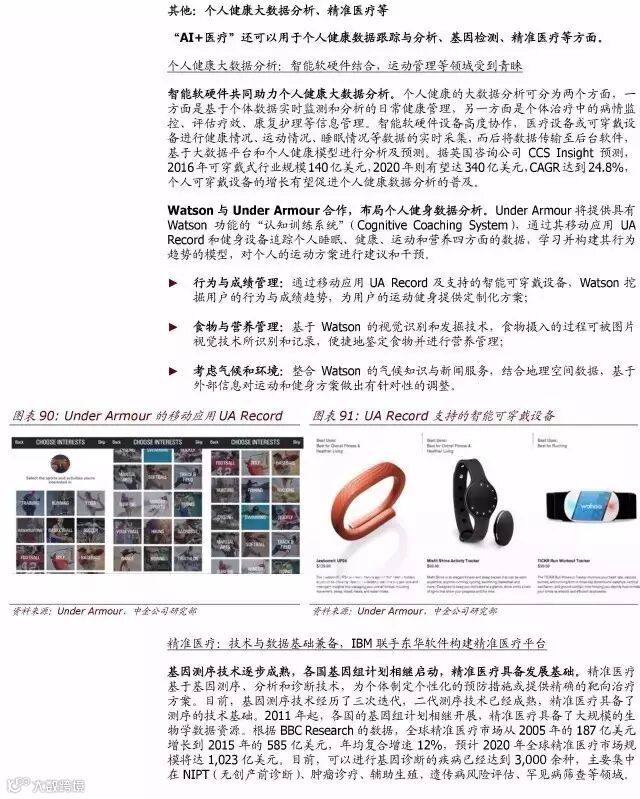 人工智能不再是概念:我们的调研发现,基于人工智能的视频分析技术正在不断拓宽安防技术的应用范围,实现实时车辆轨迹追 踪等以前只有在警匪片里才有的新功能。通过基于用户画像的精准广告投放,互联网公司在过去三年提高了广告单次点击成本(CPC)170%。IBM Watson 从 2015 年开始为病人提供肺癌等四 种癌症的个性化治疗方案。汽车主机大厂的路线图显示 2021 年前 后能够实现真正的无人驾驶服务。这些新技术的商用无疑会对公 共安全、医疗、广告、汽车制造业造成颠覆性的变化。