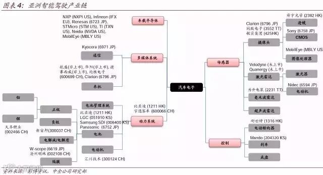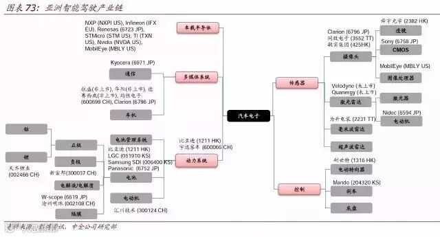 下图归纳了亚洲自动驾驶/电动车产业链的情况。