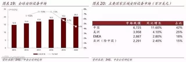 根据 IHS 统计,2016 年全球安防设备市场规模达到 158.6 亿美金,同比增长 6.6%。其 中中国市场最大,市场规模 67.25 亿美金,同比增长 11.6%,占全球 42%。美洲市场第 二,市场规模 39.6 亿美金,同比增长 4.1%,占全球 25%。