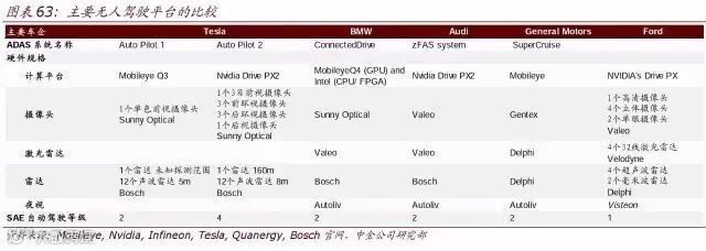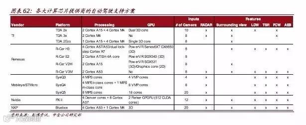 英伟达:在图形处理上先发优势明显,是汽车厂商推进自动驾驶的技术伙伴,目前 已宣布与特斯拉、奥迪、丰田、沃尔沃、博世、ZF 等达成合作。公司推出了车用超 级计算机 Drive PX2,包含有 4 个处理器(2 个 GPU,2 个 Tegra)和 12 个 CPU,每 秒可进行 2,400 万次深度学习计算,以对来自不同传感器的信息作出实时反应。同 时,英伟达通过开放 PX 平台,与相关车厂或一级供应商合作开发快速和定制化的 SoC。